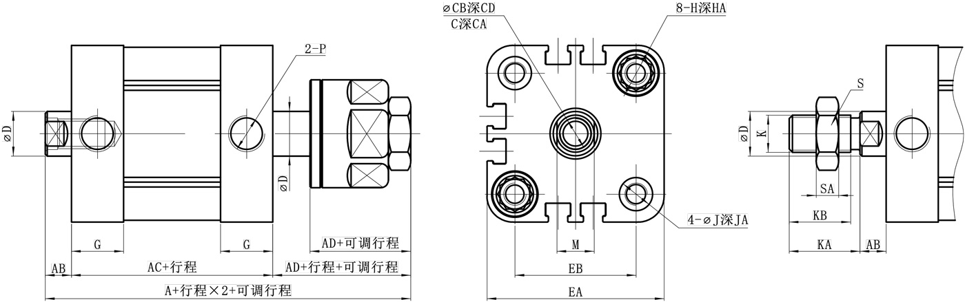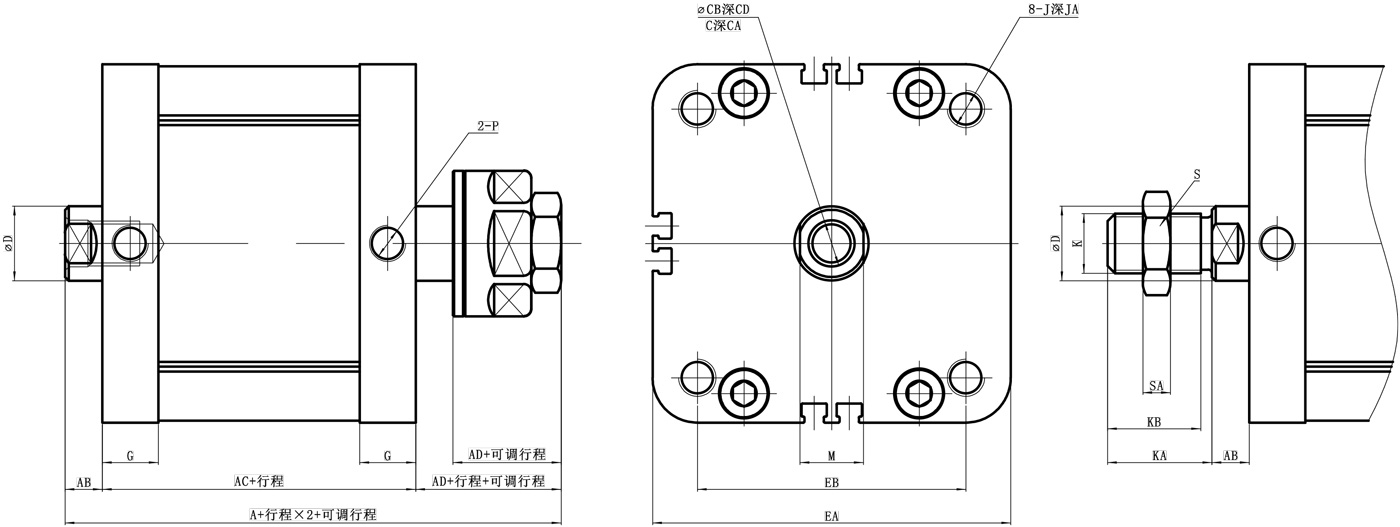 ZAE:标准型、ZAED:双轴型、ZAEJ:双轴可调型;活塞杆螺纹:空白:内螺纹、B:外螺纹