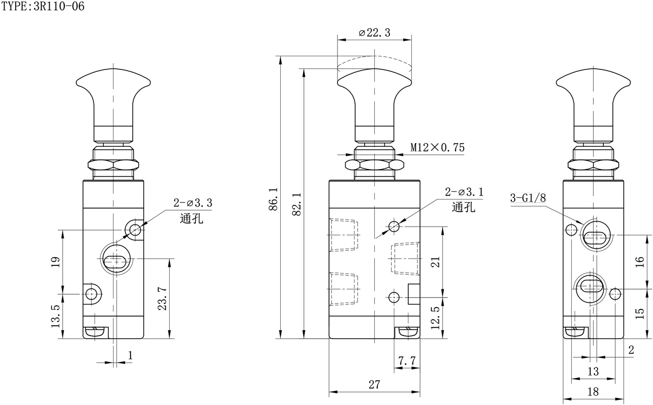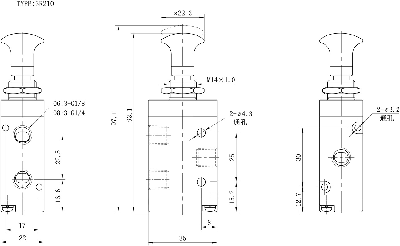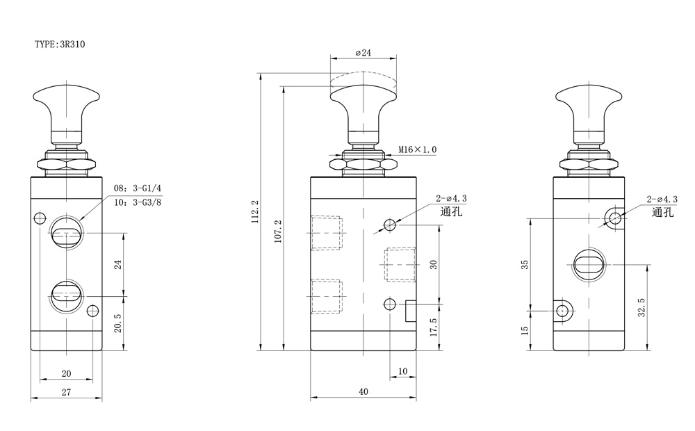 3R:二位三口手拉阀,牙型代码:空白:G牙;P:PT牙;N:NPT牙
